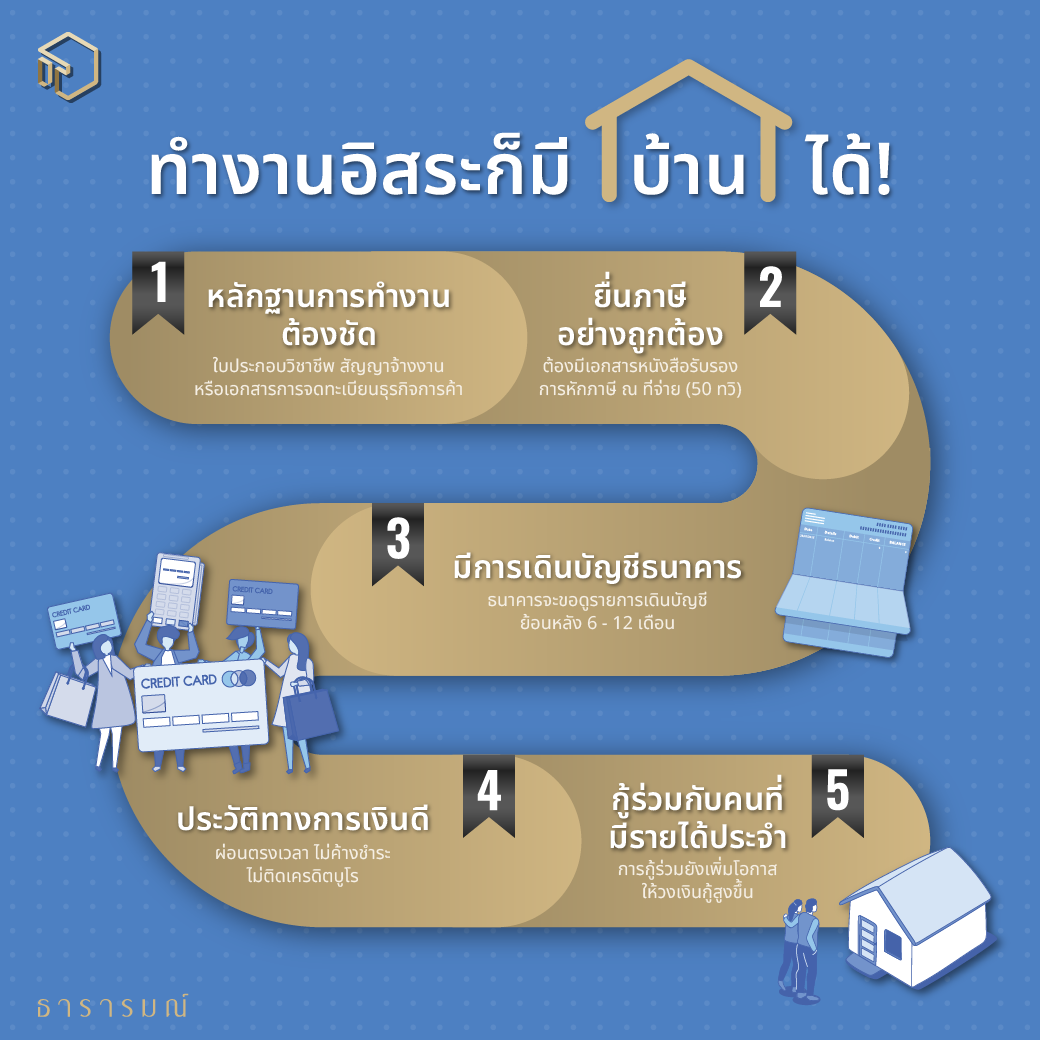 หลายคนอาจคิดว่าอาชีพอิสระอย่างฟรีแลนซ์, เจ้าของธุรกิจ, หรือผู้ให้บริการอิสระ มักจะมีปัญหาเรื่องการกู้ซื้อบ้าน แต่ความจริงแล้ว อาชีพอิสระก็สามารถมีบ้านได้ เพียงแค่เตรียมตัวและวางแผนให้รอบคอบ