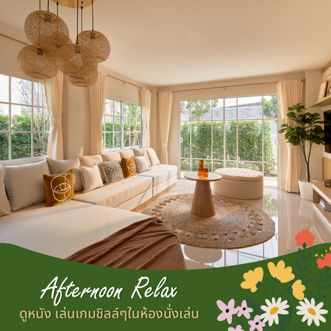 ช่วงบ่ายที่หลายคนอยากพักผ่อนก็ไม่ใช่เรื่องยาก เพราะห้องนั่งเล่นกว้างๆ ของบ้าน ถูกออกแบบให้รองรับทุกกิจกรรม จะเปิดหนังเรื่องโปรด เล่นเกมกับเพื่อนๆ หรือใช้เวลาร่วมกันในครอบครัว ทุกอย่างก็ลงตัวในบรรยากาศที่อบอุ่น