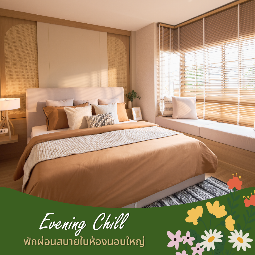 ตกเย็นเมื่อถึงเวลาพักร่างกายและจิตใจ ห้องนอนใหญ่ที่โปร่งโล่งและเป็นส่วนตัว จะกลายเป็นมุมผ่อนคลายที่ดีที่สุด ปล่อยตัวเองให้สบาย ปิดวันด้วยการพักผ่อนที่แท้จริง เติมเต็มพลังสำหรับวันใหม่ที่จะมาถึง