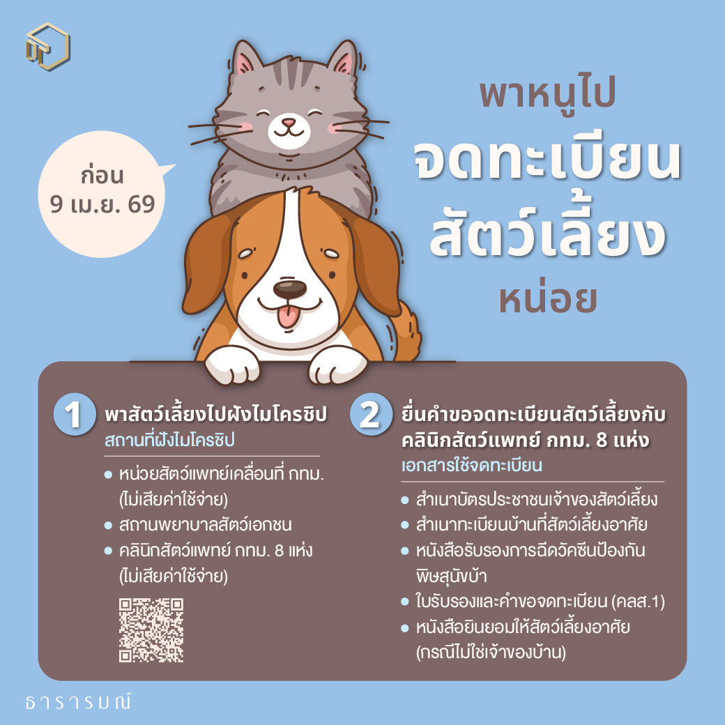 ขั้นตอนทั้งหมดนี้ไม่ซับซ้อน เพียงพาน้องไปฝังไมโครชิป และยื่นจดทะเบียน พร้อมเตรียมเอกสารให้ครบ ซึ่งสามารถทำได้ทั้งที่ หน่วยสัตวแพทย์เคลื่อนที่หรือคลินิก กทม. 8 แห่งโดยไม่เสียค่าใช้จ่าย หรือจะเลือกทำที่สถานพยาบาลสัตว์เอกชนก็ได้เช่นกัน แนะนำให้ดำเนินการให้เรียบร้อย ก่อนวันที่ 09 เมษายน 2569 นะคะ