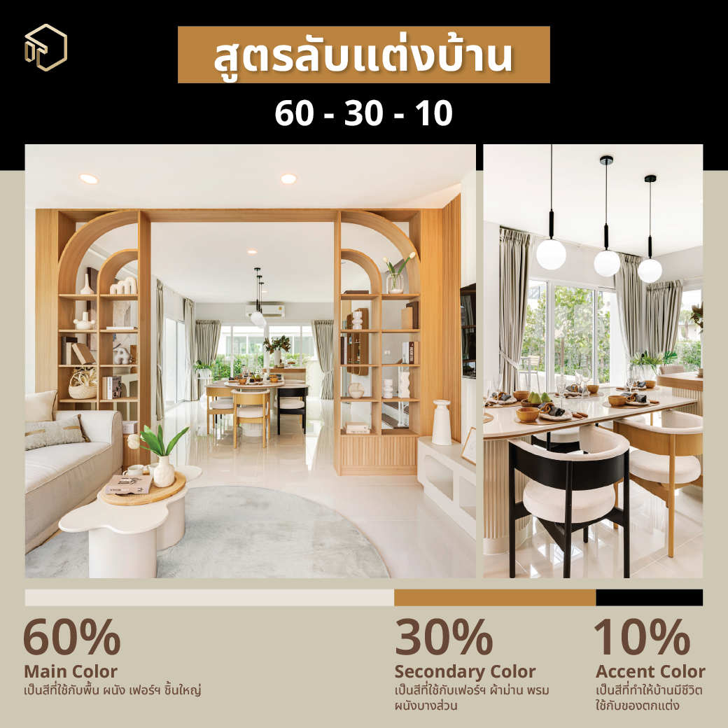 สูตรนี้เป็นหลักการแบ่งสัดส่วนของสีในพื้นที่ เพื่อให้ภาพรวมของบ้านดูสบายตา มีมิติ และไม่น่าเบื่อ เหมาะกับทุกสไตล์ ไม่ว่าจะเป็นมินิมอล โมเดิร์น หรือหรูหรา